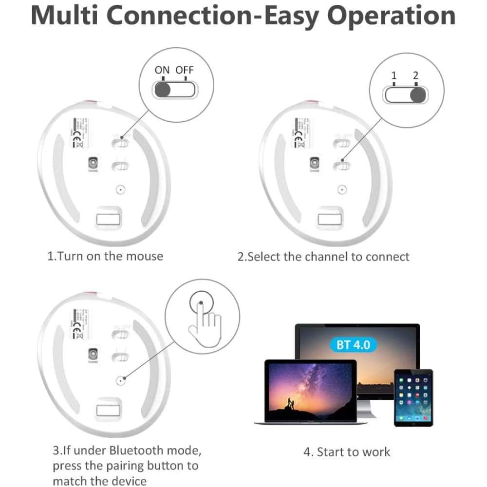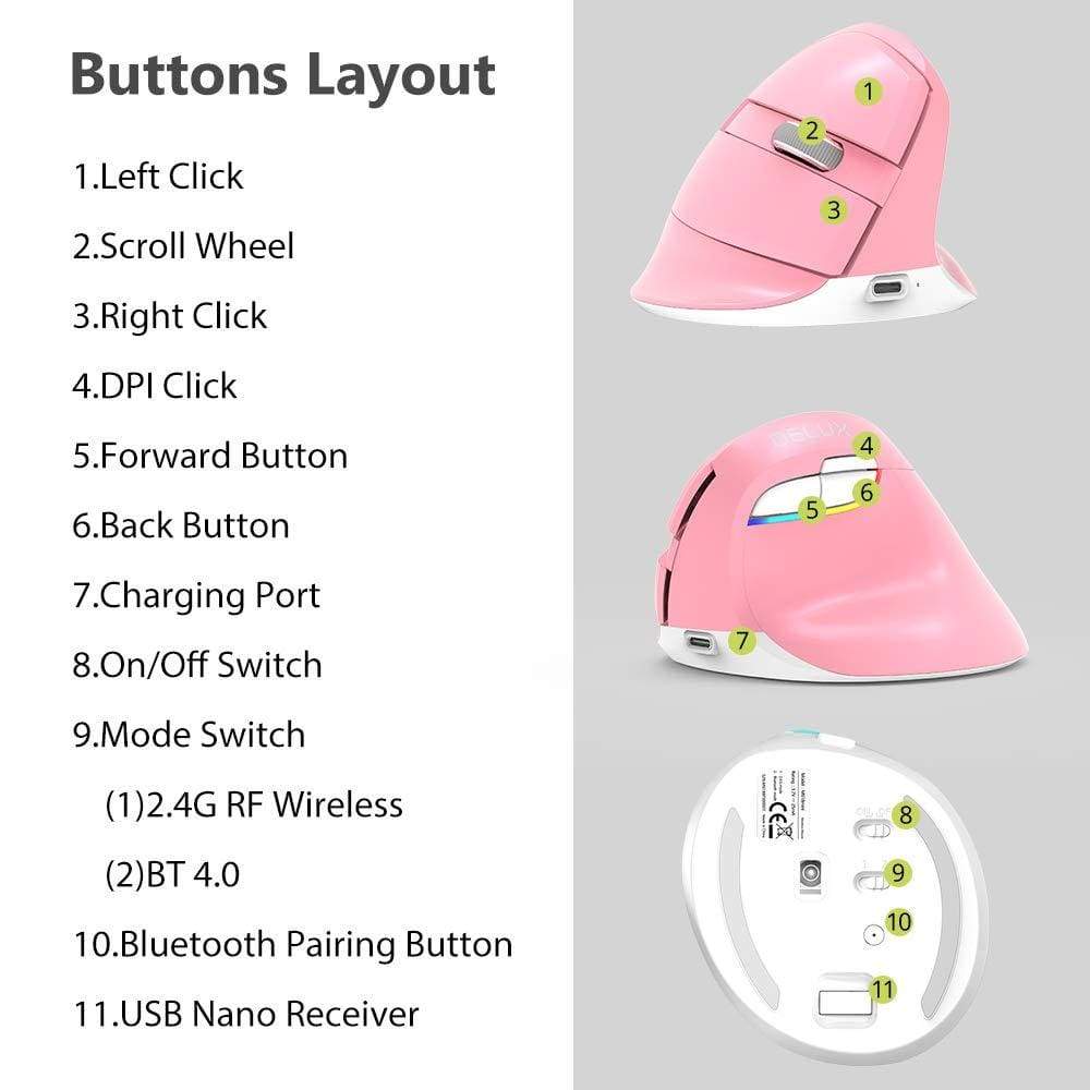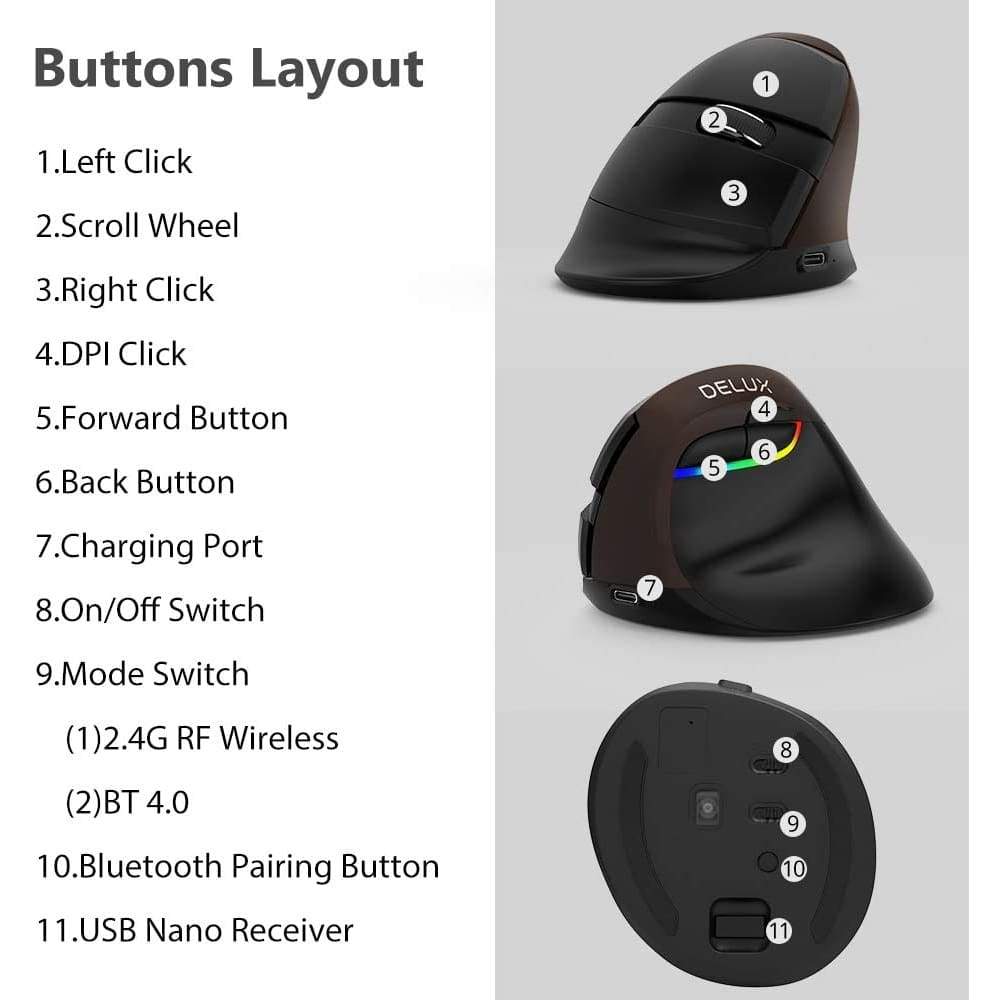 The package includes 1 Wireless Vertical Ergonomic Optical Mouse (2 AAA batteries not included), 1 2.4G USB receiver (in the bottom of the mouse), 1 instruction manual. 18-month hassle-free warranty.